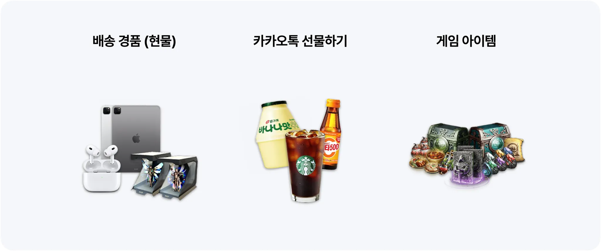 인게임 아이템(쿠폰) | 현물 경품(자체 굿즈, 휴대폰, 게임 모니터 등)