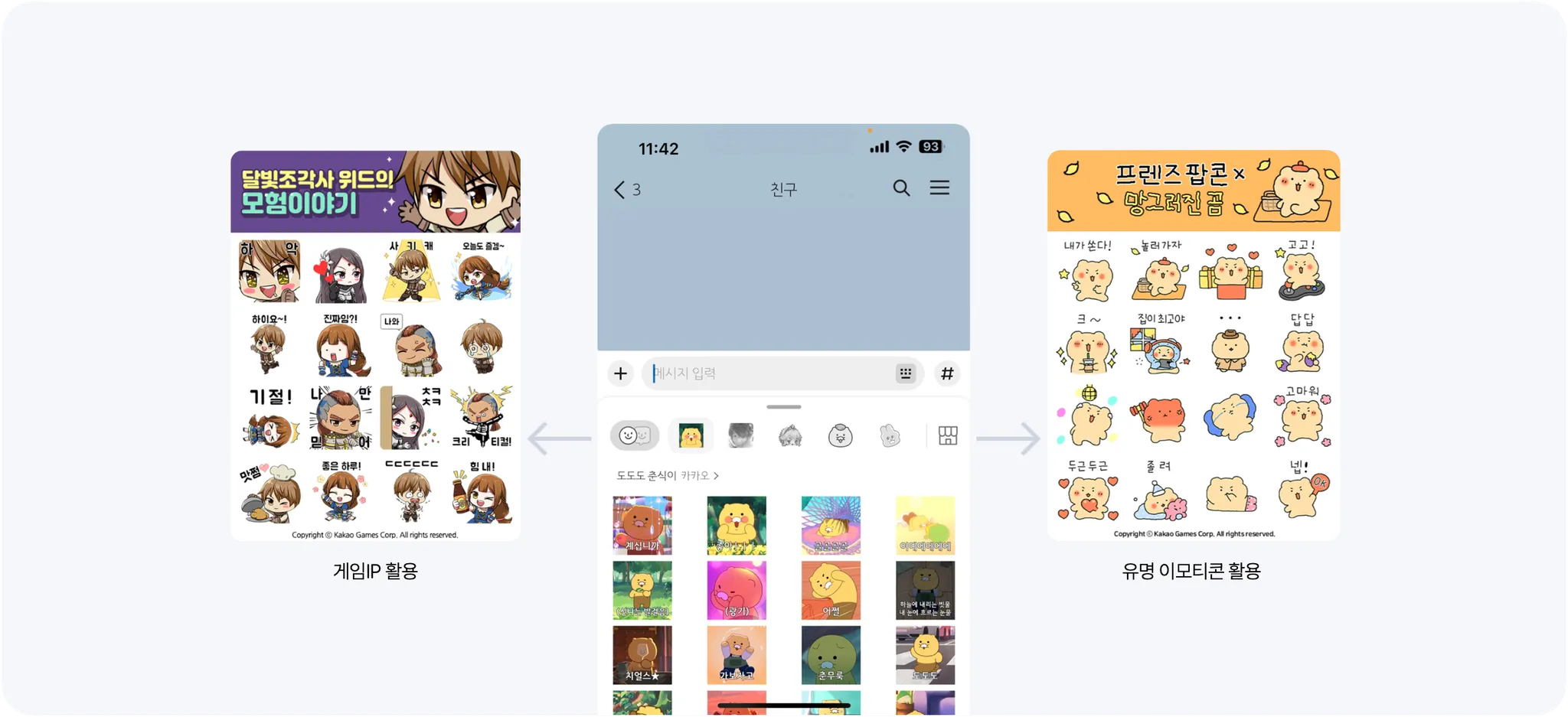 브랜드를 담은 이모티콘으로, 게임 IP나 유명 작가/캐릭터를 활용하여 전용 이모티콘 제작
